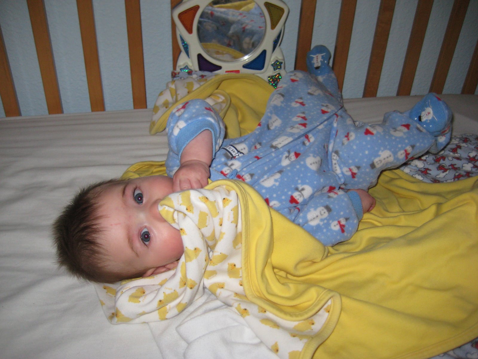 So you’d think that I would not need to worry about whether or not I am going to have vivid memories of everyday life with my baby. But my worrying skills rival my memory, I’m that multi-talented. Currently, when I try to ingrain a tender moment into my brain, I also think of memories of Luke. I probably have 3 or 5 or maybe only 1o vivid memories of nursing Luke. So I worry that I am doing too much reading and not enough memorizing of every moment with Jack. Pictures help, but this morning when I tried to capture the look on Jack’s face when I went in to get him in the morning instead of capturing 1000 words I got maybe 5. Those 5 words were “Oh. there’s the camera again.” What I was trying to capture was that his eyes are still blue, with a glint of joy, a little devil, that he was happy to see me, but also that he had been content to look at the mobile before I got there, and maybe wants to glance back at the mobile right this second; a shade of worry passes over his brow, but then it’s gone as he breaks out into a big smile, which is also fleeting, and then he’s overcome with the joy that one can attain only by seeing how much blanket can be crammed into ones mouth, and then I snap the picture. OK, words aren’t going to do it either. But the process of trying to come up with the words or the picture may be what helps me with the memory.