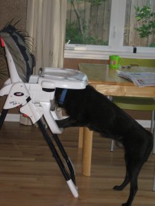 Tired of all the focus on Jack eating in his highchair? So was Bean. “It’s baby this and baby that. What about poor Bean? You’d think no one ever ate mashed, strained food before. Oh, now he gets cheerios, whoop de fricken doo. Ooooh. Finally. There is something in this for Me.”