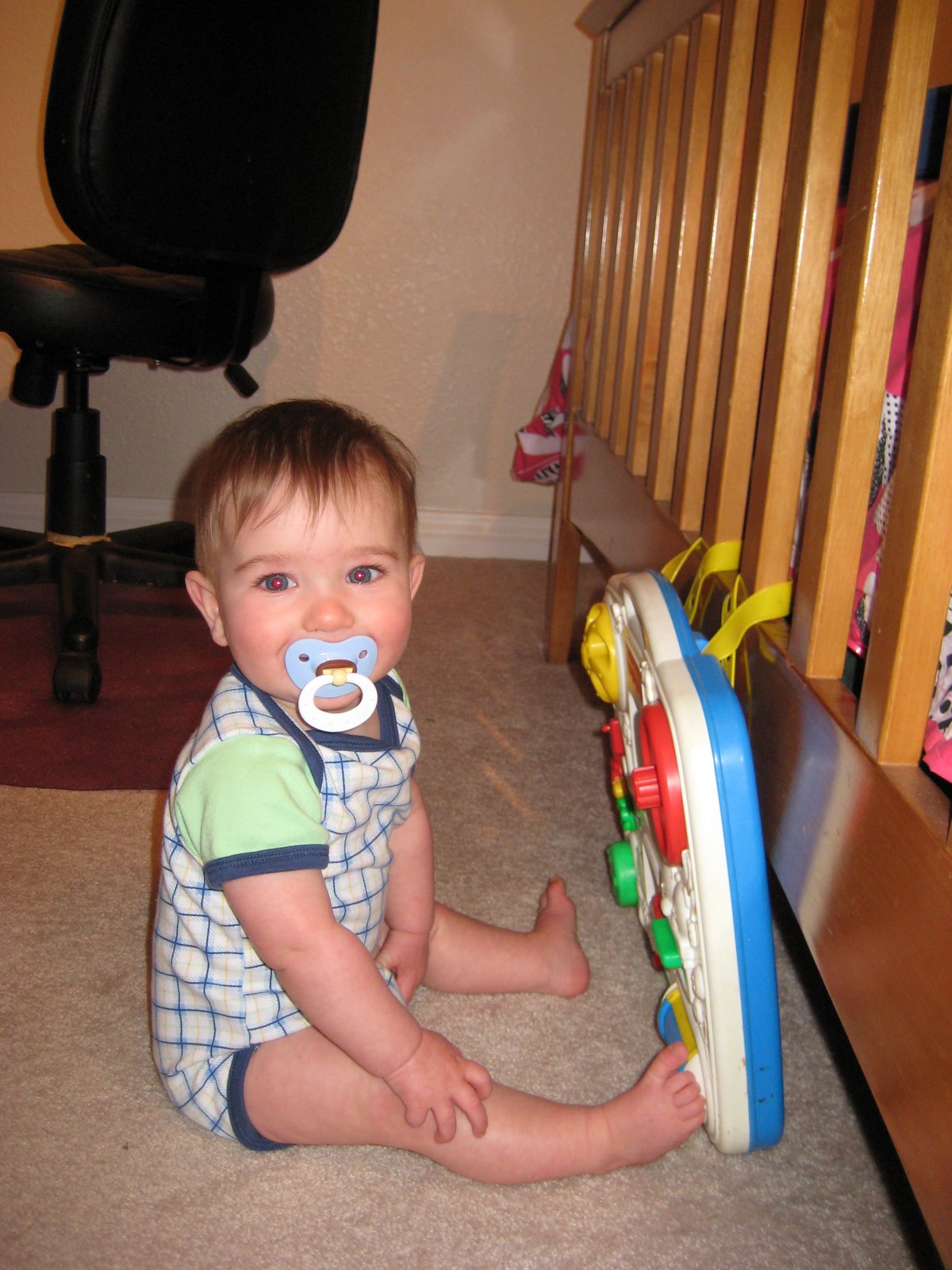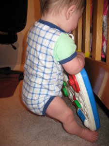 faster than I could snap a photo and still get his whole head in the picture!!! All my attempts to thwart his progress towards crawling have caused the sublimation of his mild desire to crawl into a burning desire to stand up and walk. Time to baby proof. For reals! For reals. (As Luke would say.)