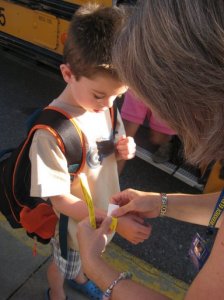 From there it was no big deal. Luke got off the bus and got a bracelet that marked him as a bus rider so the teachers would know where to send him at the end of the day, and we walked to the playground. Luke was pretty stoic and he just stood next to me, not letting me take his picture until it was time to go in.