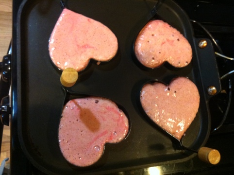 Note to self: Food-coloring-pancakes look much better with white flour. The whole wheat flour just made this turn out really weird. I started off making smiley faced pancakes, and while those were cooking, I got out the cookie cutters because I was making Luke’s lunch and I wanted to cut his sandwich into the shape of a heart. (I know, I am the best.) And then I found the heart shaped pancake cutters! I forgot about those! So in the mean time, I slightly over cooked the smiley face pancakes. I gave the kids the first batch off the stove and they were deemed, “sunburned on one side and really tan on the other side.) There was a lot of laughing. Then I moved on to heart shaped pancakes which turned out slightly better. They were delicious! My goal in every motherly thing I do is to create a memory that my children will look back on fondly, and the sunburned faces might do the trick.