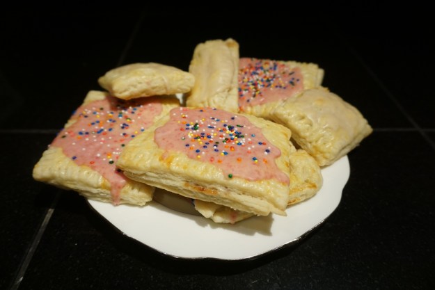 I was in line at the grocery store the other day and I saw a magazine with homemade pop tarts on the cover, and I knew what my next Fancy Breakfast Friday was going to be. Pop tarts were something my mom never ever ever bought when we were growing up. She did buy toaster strudel once, so I’m not sure what she had against pop tarts. If I had to guess, I would say that she thought pop tarts were gross, or possible too expensive. When I grew up, got a job, and became hungry and bored one time, I got pop tarts out of the vending machine. They were OK. For the calories, I would take a candy bar any day, so that was that. I’m pretty sure my kids have never had pop tarts either, because they are the kind of thing I would eat if they were in the house, and then feel like it wasn’t worth it. However, for some reason the homemaede pop tarts called to me. I decided just to make them, and not use a recipe, just totally wing it. I made a pie crust, and rolled it out thin and chilled it for an hour. (OK fine I used a pie crust recipe – this one here, I chose water, not milk for the liquid.) Then I cut out rectangles of approximately matching sizes, I wanted to make 12 so everyone could have 3… so I had to make them smaller and smaller as I went along. I brushed the bottom with an egg wash and added the filling. Strawberry jelly for the strawberry ones and brown sugar and cinnamon for the others. I put the tops on and used a fork to seal the edges. The tops were brushed with egg wash and then I baked them at 350 for 25-30 minutes. Once they were cool, I made a frosting of powdered sugar, a little milk, vanilla and brown sugar. Once I had frosted all the pop tarts with brown sugar filling, I added strawberry quick to the frosting for the strawberry pop tarts. It took about an hour for the frosting to set, so this was a “make it the night before” recipe. For breakfast I warmed them up in a 350 oven for 5 minutes. Served with bacon and eggs. They were described as “good” and “buttery and sweet.” Not the highest praise I have ever received, but they were fun to make!