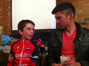 Here is a picture of Luke meeting Alex Howes, who was very friendly and motioned for Luke to come sit next to him and chat when he could see that Luke was shy about approaching him. Very cool.