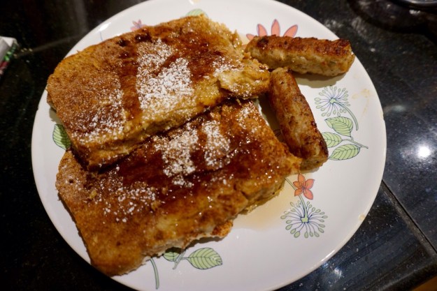 I made this bread the night before from the new cookbook that my sister in law got me for my birthday: Flour Water Salt Yeast. (Thanks Suzanne!). Then I haphazardly threw together eggs, milk, vanilla, brown sugar, cinnamon, and nutmeg. As I was making the egg mixture I was imagining teaching my grandkids how to make French toast, (can’t get my kids interested so I am biding my time) and I imagined myself saying, “Just a hint of nutmeg, it’s the secret ingredient.” But I was paying more attention to my imaginary, loving and attentive grandchildren then to what I was doing and I put more than a hint of nutmeg in. I opened the wrong side of the spice jar, and let’s just go ahead and call it a teaspoon. Maybe two. Regardless, the French toast was delicious.